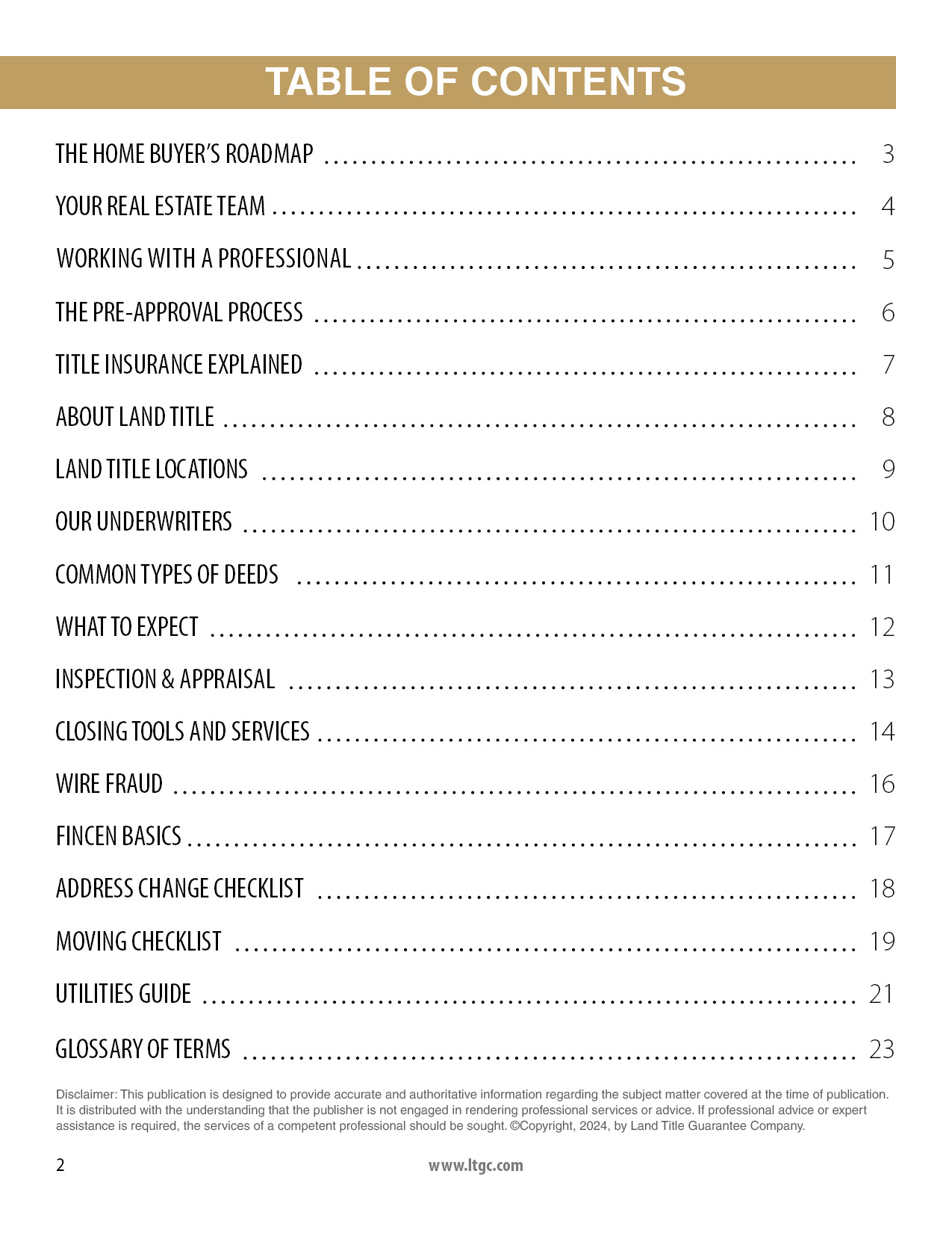Are you working with new buyers and want to make a lasting impression? Let us customize our Buyer’s Guide for you. This digital guide contains helpful information on everything from starting the home search process, to the steps of a closing, to the importance of working with a real estate professional. We will provide you with a digital version so you can print it at your favorite print shop. Interested in getting it for free? Ask your Land Title Sales rep.