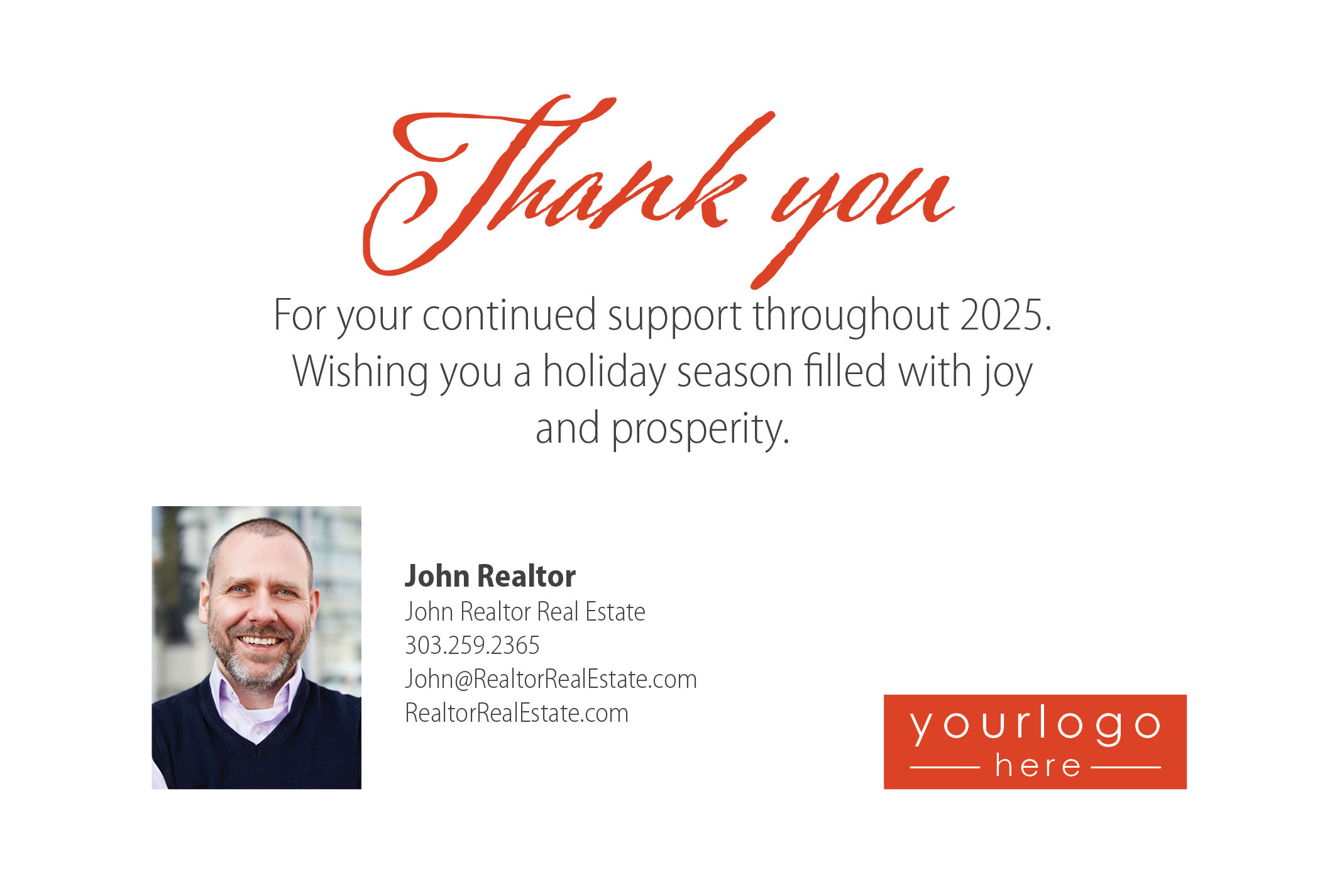Send out folded greeting cards to your sphere. All greeting cards will be mailed first-class in white envelopes. Requires a minimum of 500 cards.
